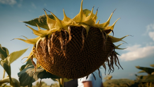 Корзинка — довольно крупная, позиция корзинки поникшая, что способствует уменьшению повреждений от птиц.